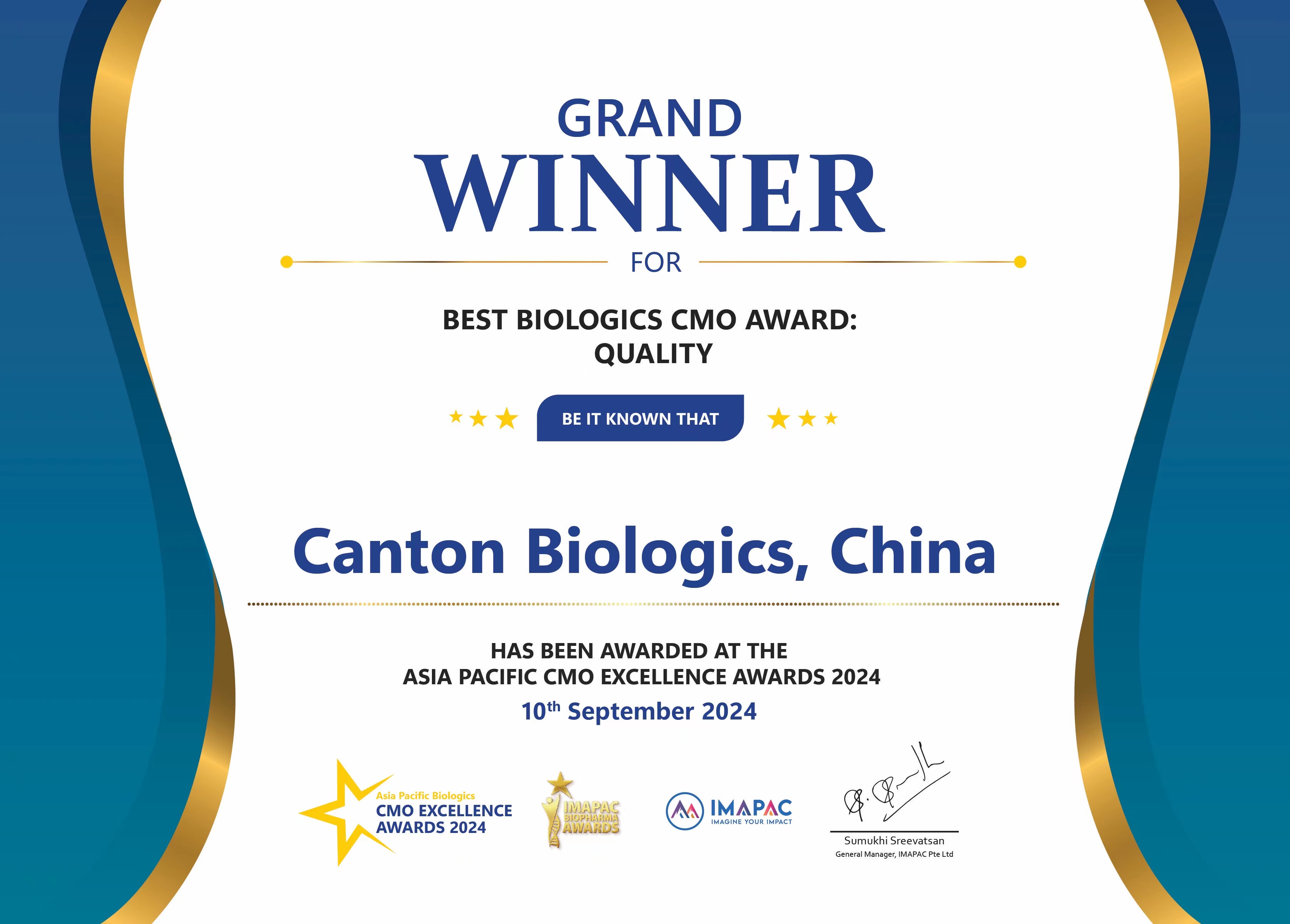 喜讯 | 汉腾生物获IMAPAC“Best Biologics CMO Award: Quality”