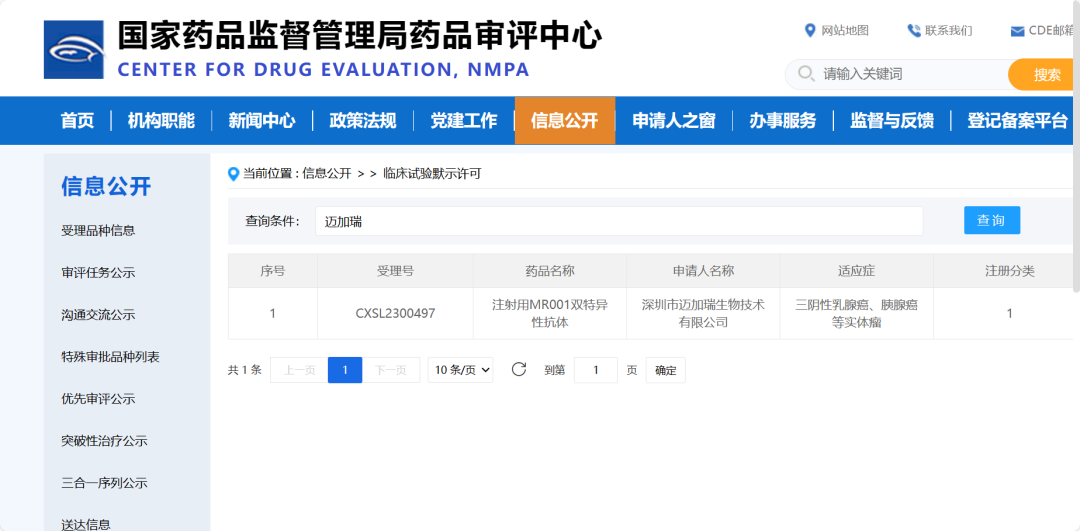 2023 年 9 月 27 日,汉腾生物重要合作伙伴——迈加瑞生物宣布其广谱抗实体瘤重症药物“注射用MR001双特异性抗体”(以下简称MR001),已通过中国国家药品监督管理局审评(受理号CXSL2300497,通知书编号2023LP01942),获准进入临床阶段。汉腾生物对合作伙伴的进展表示热烈的祝贺!